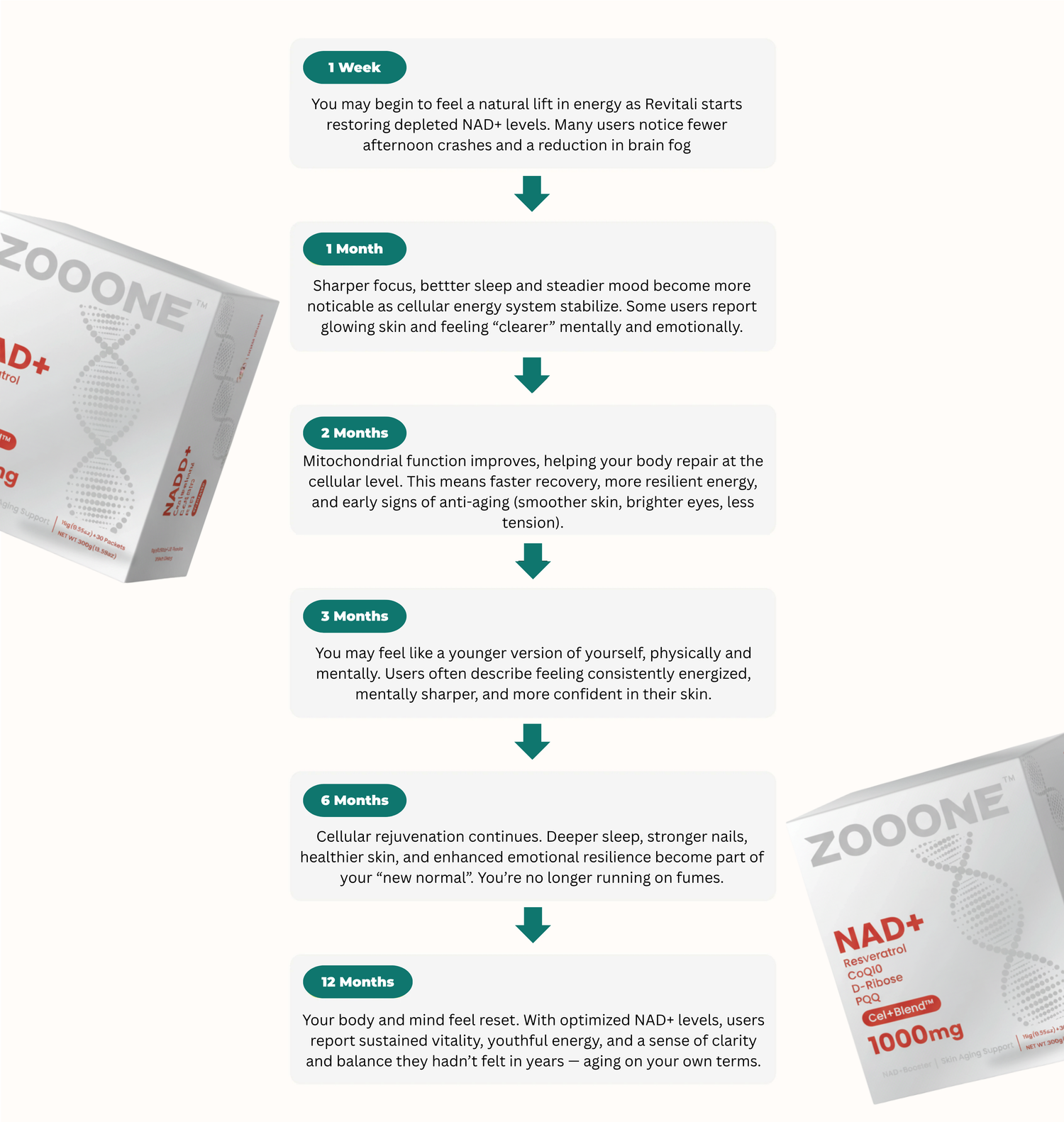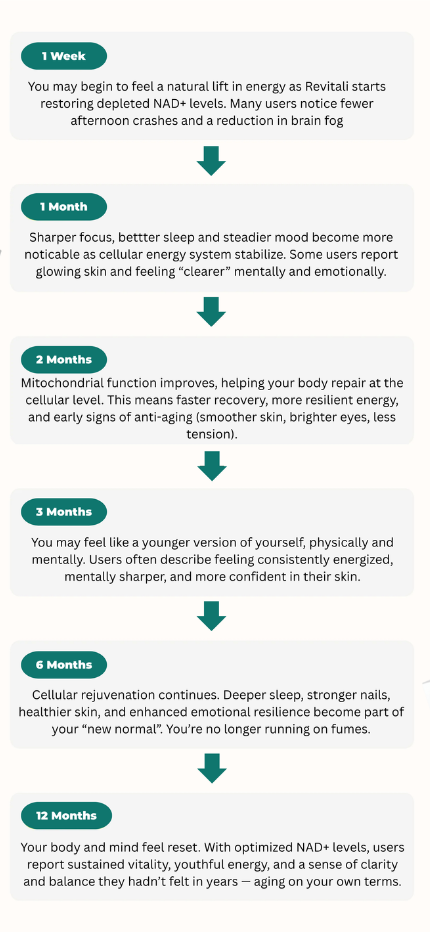 Revitali’s Liquid NAD⁺ Drink helps restore your body’s natural energy and glow from within — so you can wake up clear, steady, and radiant again. One simple, science-backed ritual a day.